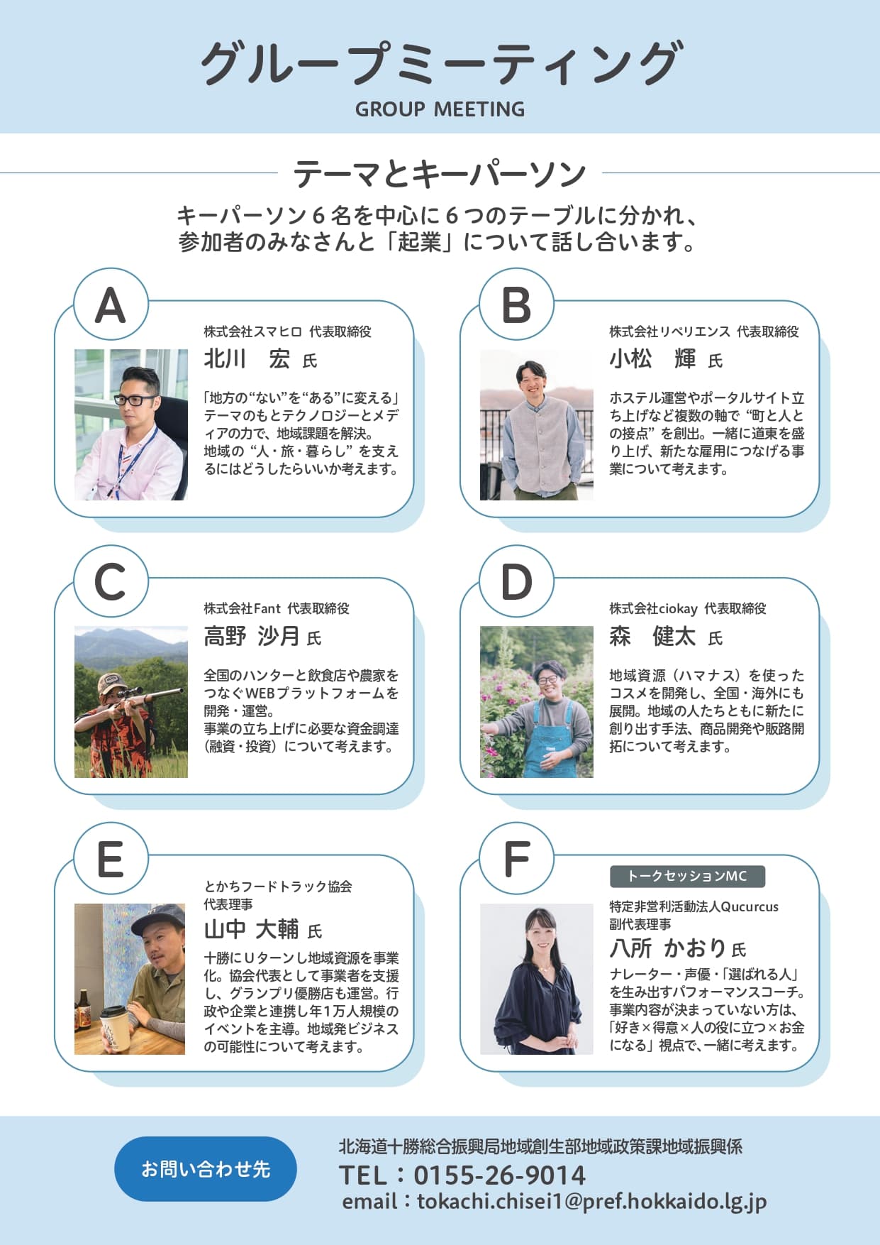 QRコードまたは専用URLより申し込み後、キーパーソン(A〜F)から参加したいグループミーティングを第3希望まで選択します。お気軽にご参加ください!