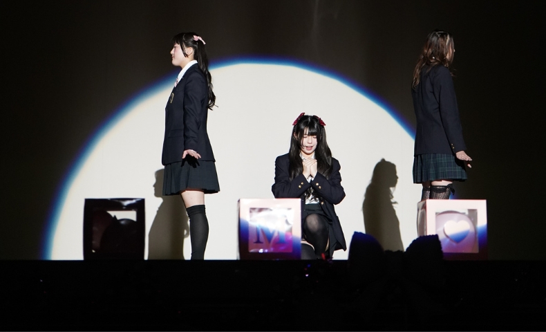 第3部では少し長めのインターバルを置き、制服姿で登場。ステージに立つ3人の表情も、どこか素に近いものに見えます。1曲を歌い終えたあとのMCで、まいまいさんは「初期メンバーとして活動してきた3年間、あっという間だった」と振り返ります。
