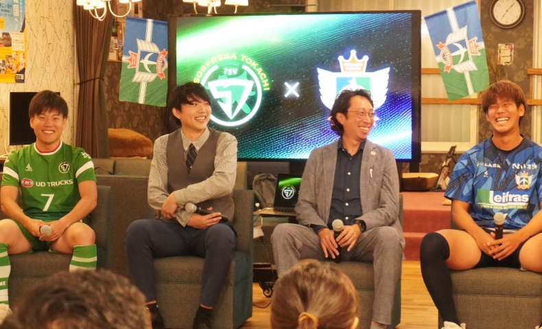 調印式の後には、両クラブの選手が登壇する特別トークショーも開かれました。帯広北高校出身で同級生、名字も同じという吉田哲登選手(スカイアース)と吉田愁平選手(ソルプレーサ)が参加。