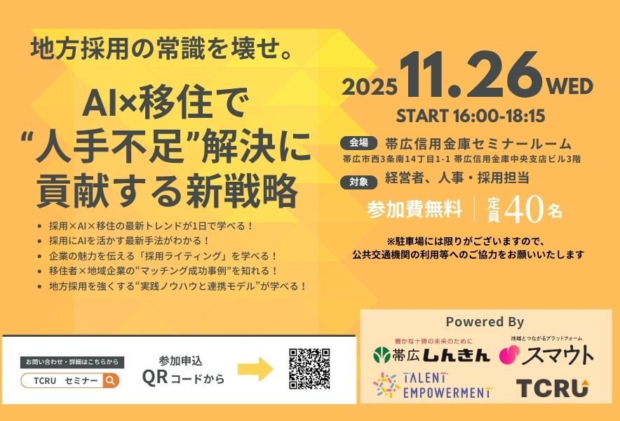 十勝の経営者・採用担当の方に朗報です!11月26日(水)、「地方採用の常識を壊せ。 AI×移住で”人手不足”解決に貢献する新戦略」のセミナーが帯広で開催されます。