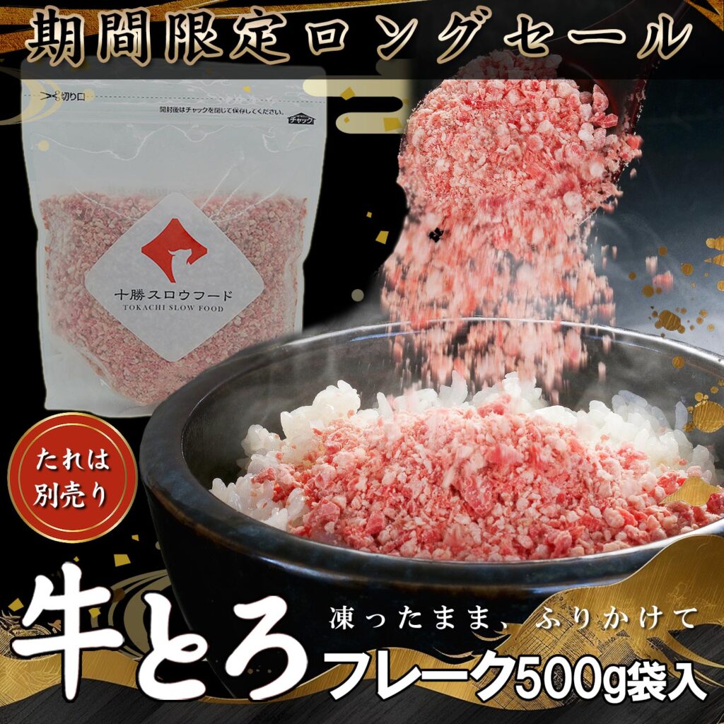 十勝スロウフードの看板商品「牛とろフレーク」は、あたたかいご飯にふりかけるだけで、牛肉の脂がじんわりとろけ、口の中に旨みと甘みが広がる新感覚のご飯のおともです。