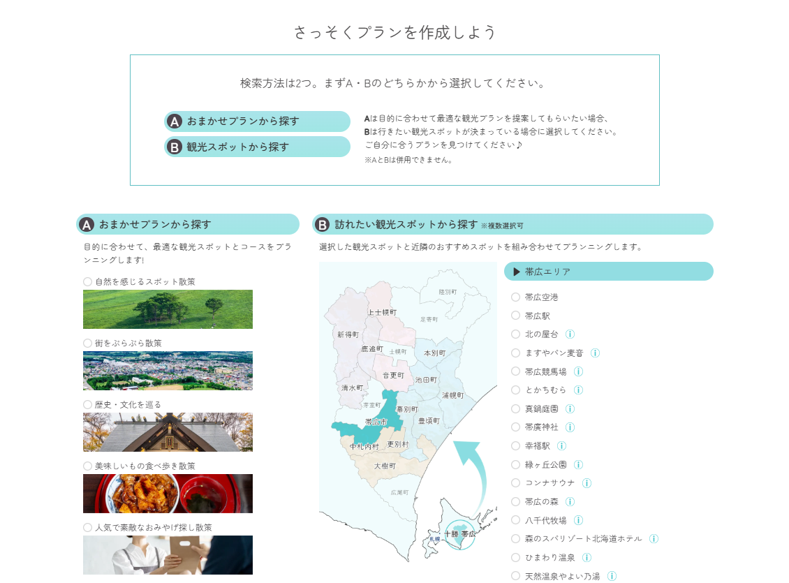 観光スポット・旅のテーマ・日程・同行者などの条件を入力するだけで、“一人ひとりに最適な十勝観光プラン”を自動生成する機能です。旅の計画に悩む方や、十勝を効率よく満喫したい旅行者にとって、これまでにない利便性と楽しさを提供します。
