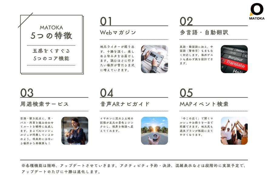 ユーザーが何を読み、どのルートを検索し、どこで予約したか——これらのタッチポイントを収集し、熱量の地図を描きます。可視化されたデータは自治体のプロモーション設計や事業者のメニュー開発に活用され、次の旅行者へより洗練された体験となって循環します。MATOKA はコンテンツを“消費”で終わらせず、“共創”へ昇華させるエンジンなのです。